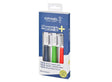 • Features a blue paring knife, a green serrated knife, and a red peeler