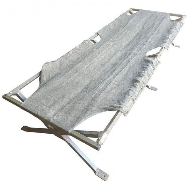 This Belgian Military Heavyweight Folding Camp Bed is perfect for a comfy night's sleep. It is a wider and longer than a conventional camp bed, with a length of 210cm and width of 75cm and is made of a cross legged sturdy steel frame, with flat feet so the bed can be pegged into place. The canvas top is attached to the steel frame with the paracord provided. The bed can be compacted down into a canvas bag and weighs approximately 18kg. These beds are used but in a great grade 1 condition.