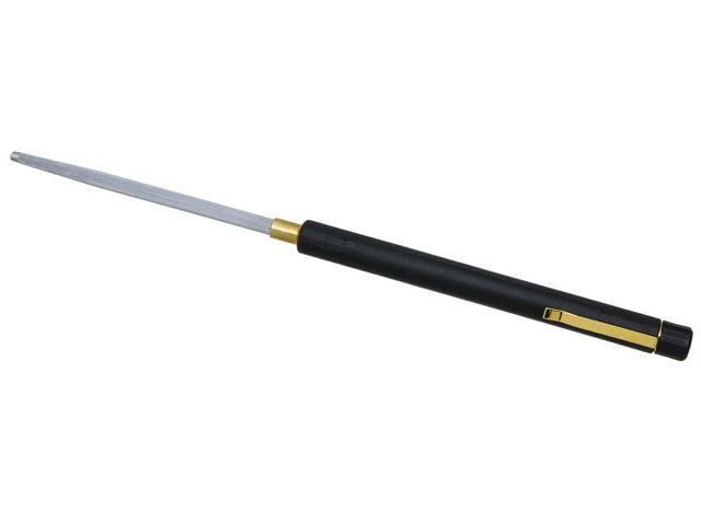 This compact sharpener features a 3.75" blade that easily stows away in a plastic pen barrel with a brass top and clip, making it portable and convenient to carry. With an overall length of 9.25", The Pocket Pro Sharpener is suitable for both plain and serrated blades, catering to a wide range of cutting tools.