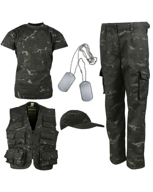 The Kombat UK Kids Explorer Army Kit - BTP Black is perfect for playing soldiers, exploring the outdoors or even just for casual wear. This fun explorer army kit includes a t-shirt, trousers, tactical vest, baseball cap, which all feature a BTP black camouflage pattern, and also silver dog tags. A great gift for your little solder or mini adventurer, let their imagination run wild as they embark on their wildest adventures yet.