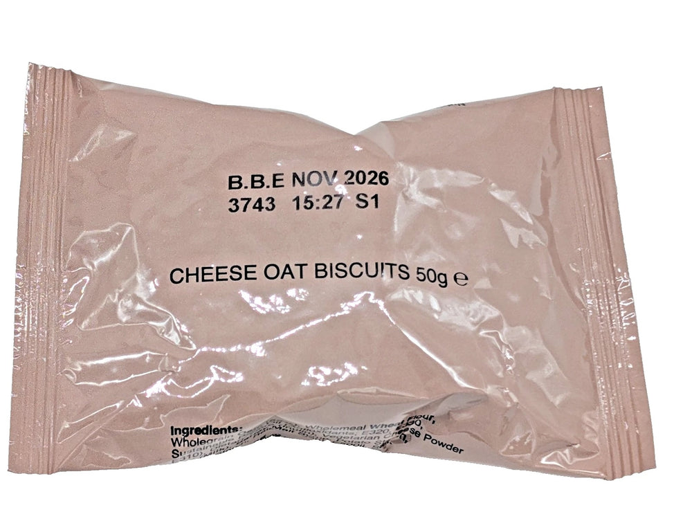 The British Military Ration Pack Accessory - Cheese Oat Biscuits 50g are perfect paired with some chutney or dips! At just 50g a pouch, each pouch contains 4 delicious cheese oat biscuits and are designed to last for up to 20 years making them great to stash in your bug out bag or long term survival supplies.