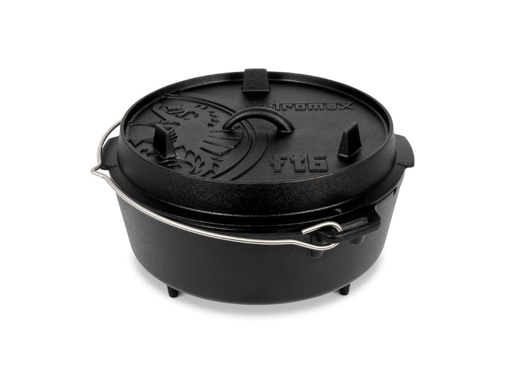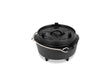 Designed for outdoor cooking enthusiasts and home chefs alike, this Dutch oven features three sturdy legs for stable placement above embers or coals. The raised lid edge allows hot coals to be positioned on top, providing all-around heat-ideal for baking bread, slow-cooking stews, roasting meats, or simmering soups. A built-in hole in the lid accommodates a thermometer, enabling precise temperature monitoring without disturbing the cooking environment.