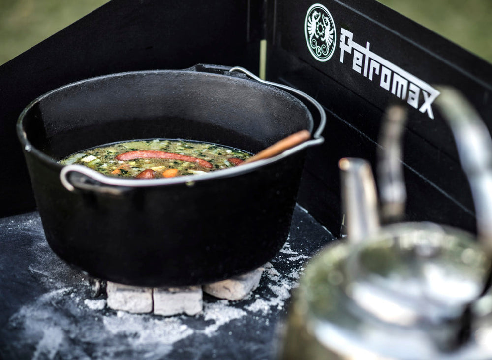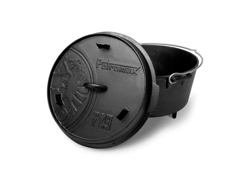 Handling is made safer with a robust handle for lifting, and the companion Petromax Lid Lifter (sold separately) simplifies the removal of the hot lid. Unlike some models, the lid itself does not function as a pan, focusing instead on optimal sealing and heat retention. The iconic Petromax dragon emblem adorns the lid, symbolising quality and durability.